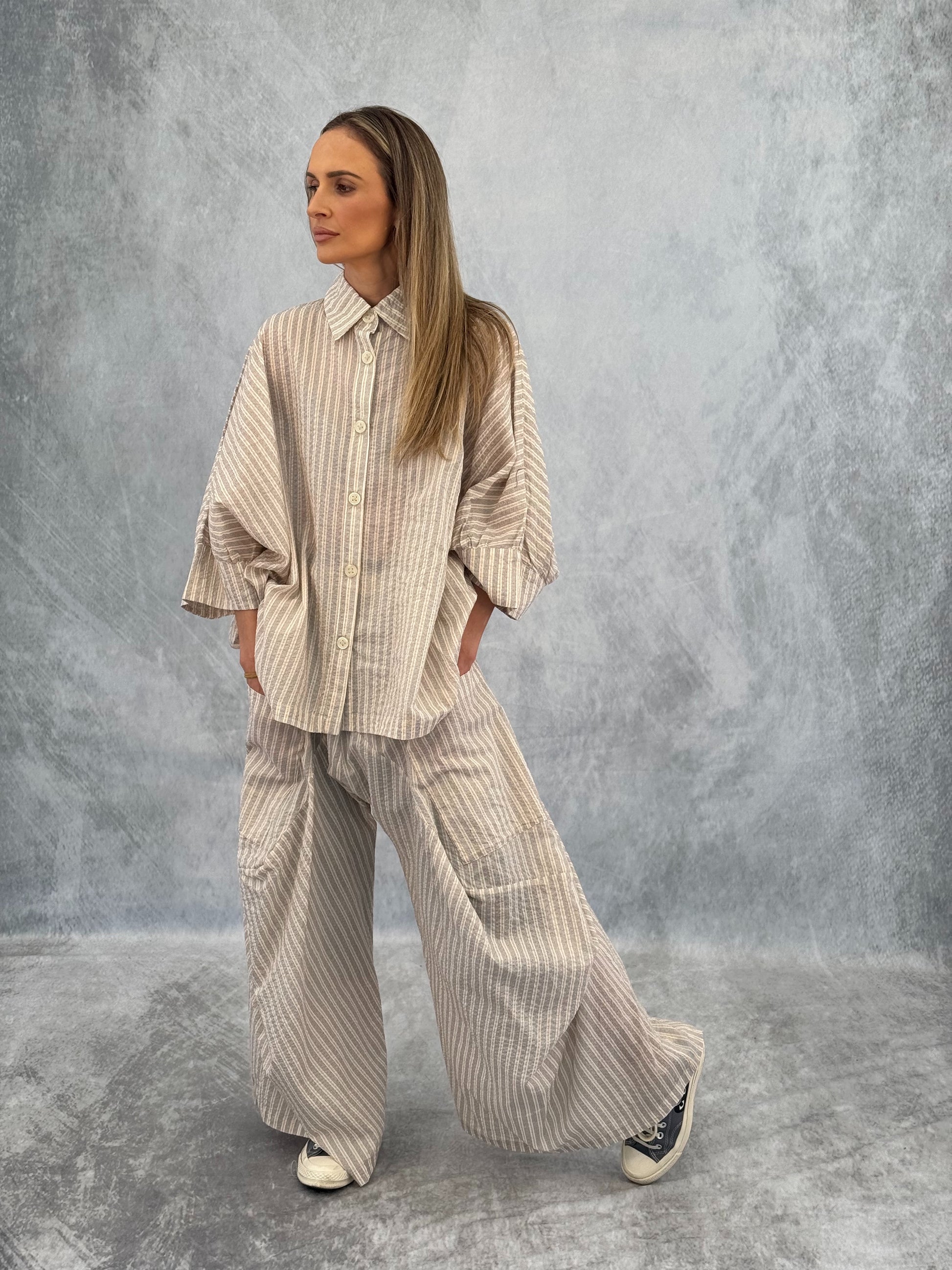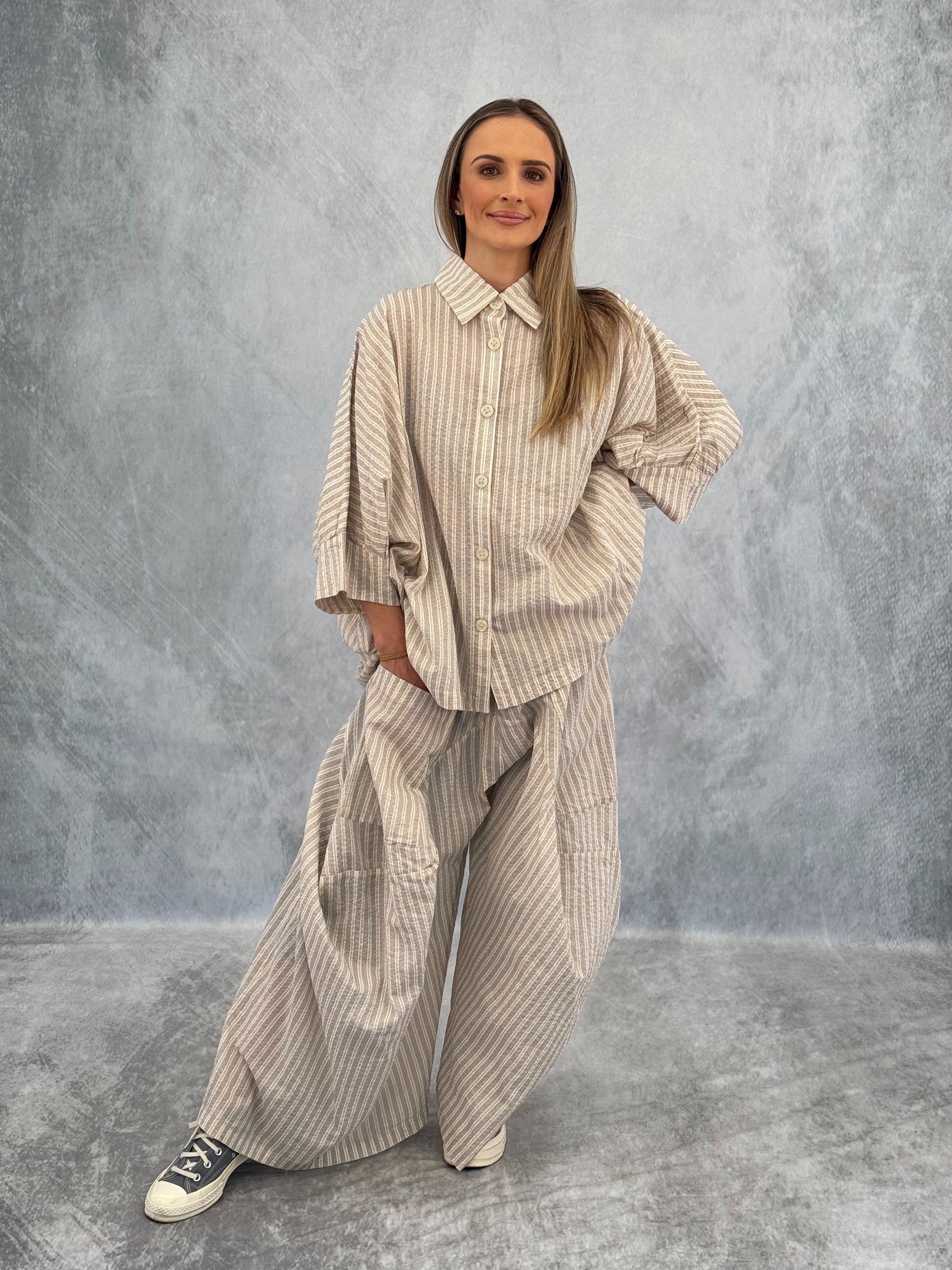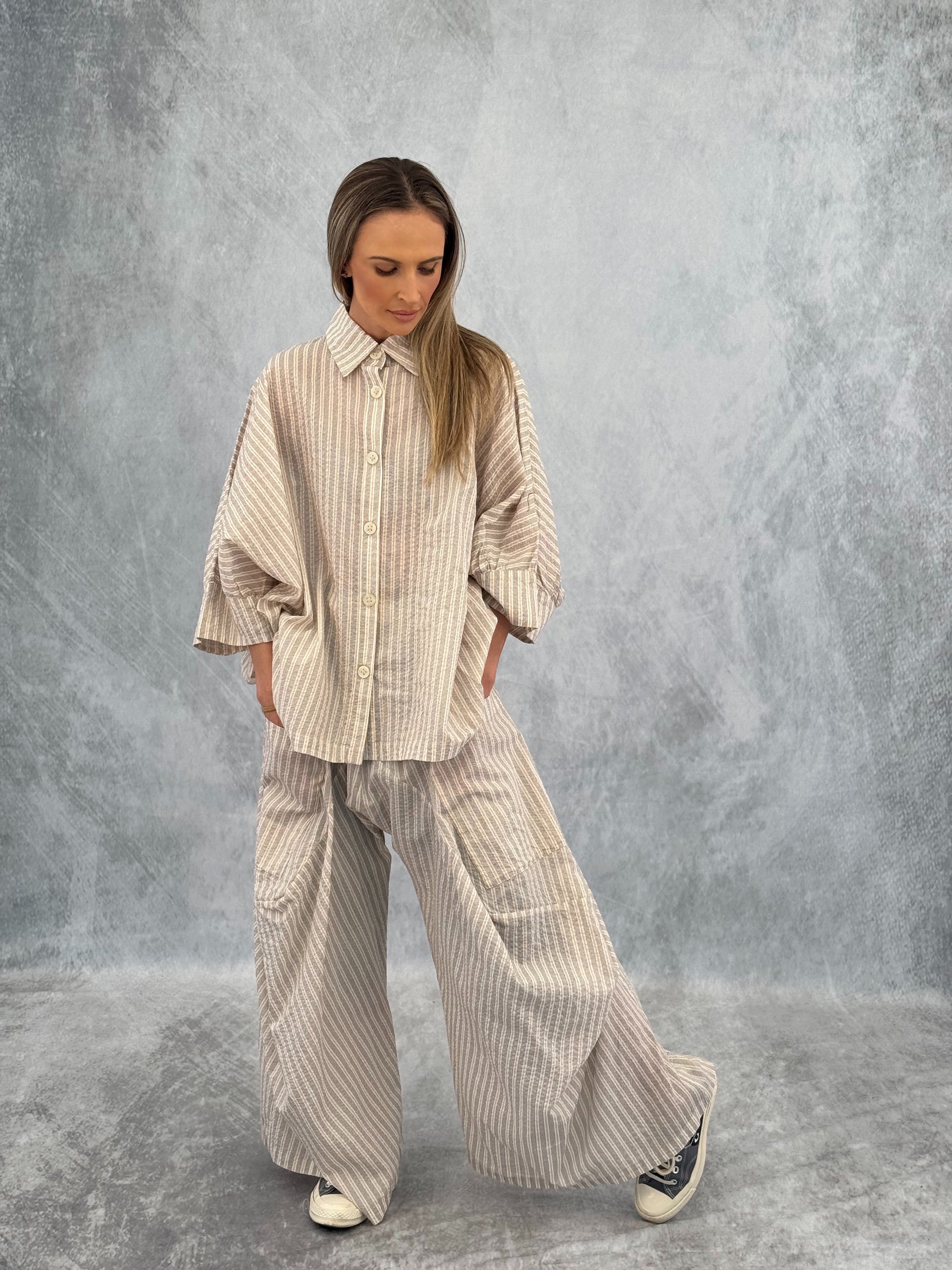 Taupe mix stripe, lightweight cotton, machine wash and dry